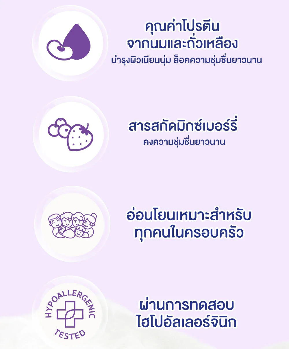 • With Double Milk, a combination of milk protein and soy milk, it helps to keep your skin soft, smooth, and moisturized for a long time. Light, non-sticky