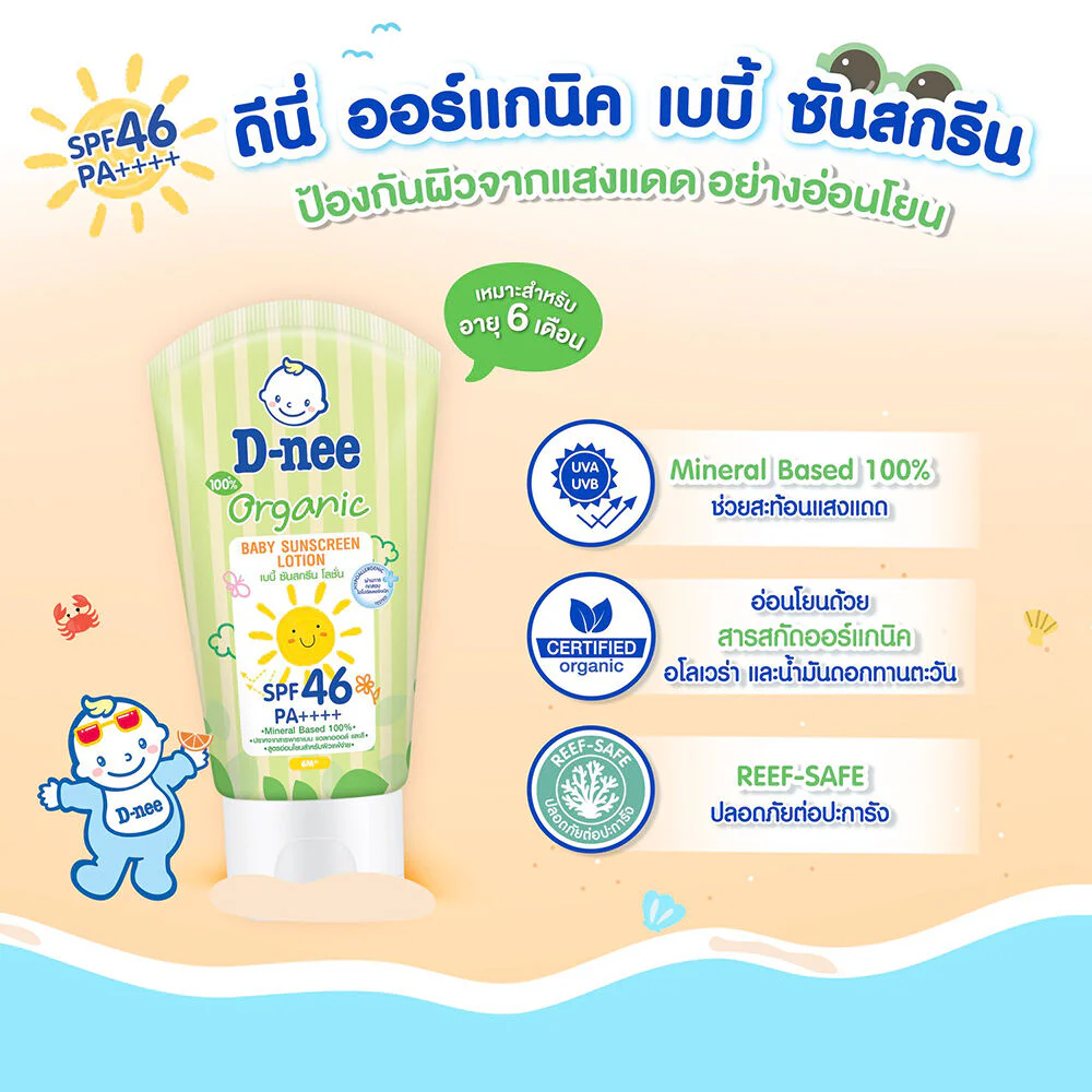D-nee Organic Baby Sunscreen Lotion SPF46 50ml Sunscreen lotion can be used on both the face and body. It reflects UVA / UVB rays and prevents them from penetrating the skin. It is gentle on sensitive skin with aloe vera. It helps moisturize the skin with ceramides and vitamin E. It does not contain any chemicals that are harmful to corals.