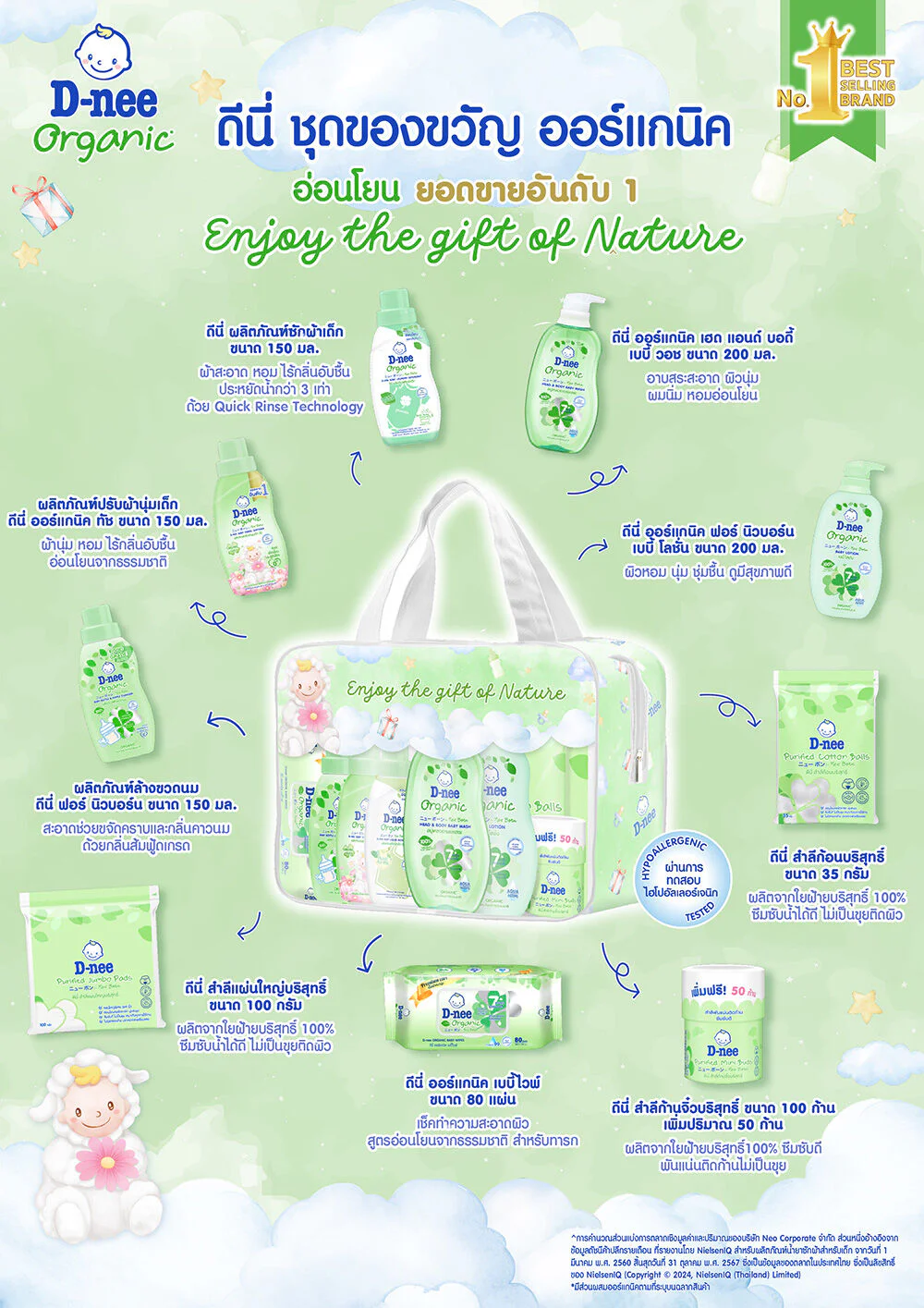 D-nee Organic Giftsets A gift set for newborns with a convenient carrying bag that is extra gentle on your little one's skin. With pure natural extracts, tested by skin experts that it is safe, non-allergenic (Hypo-Allergenic Test) or non-irritating (Irritation Test) from international institutes.