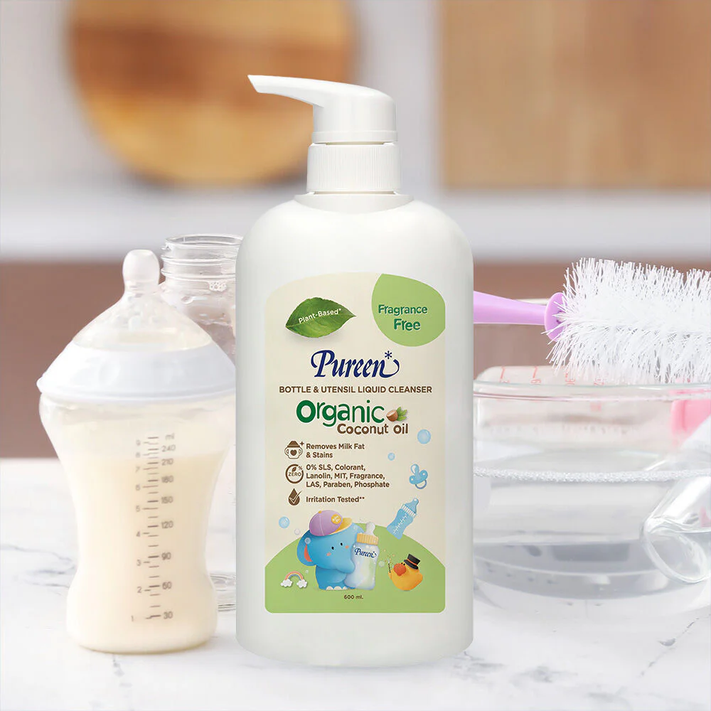 Pureen Organic Bottle & Utensil Liquid Cleanser Pump 600ml Organic Bottle Cleanser contains USDA certified organic coconut oil, dermatologically tested and non-irritating.