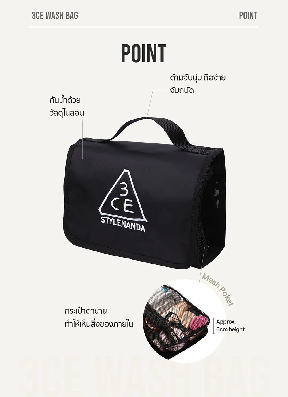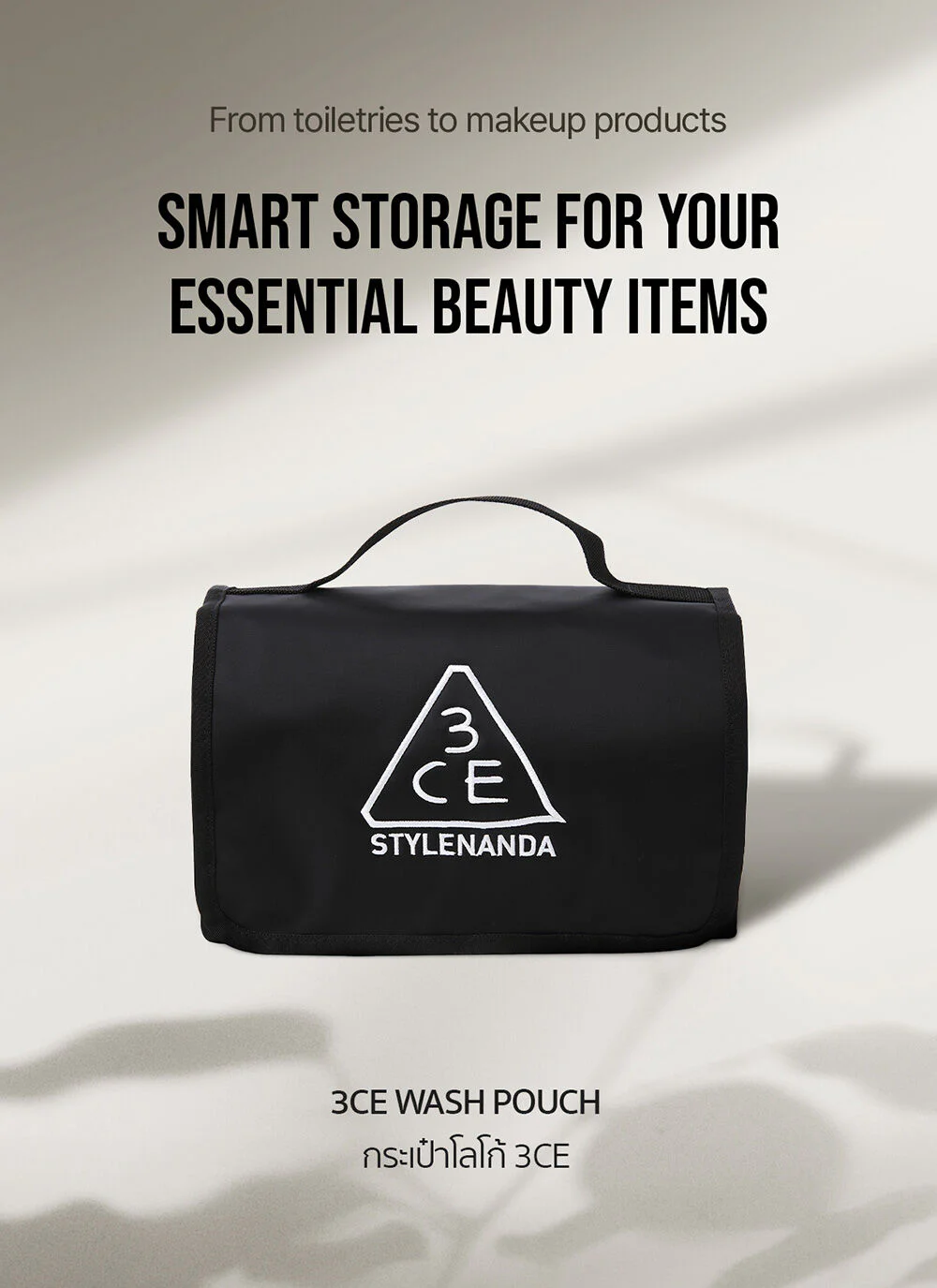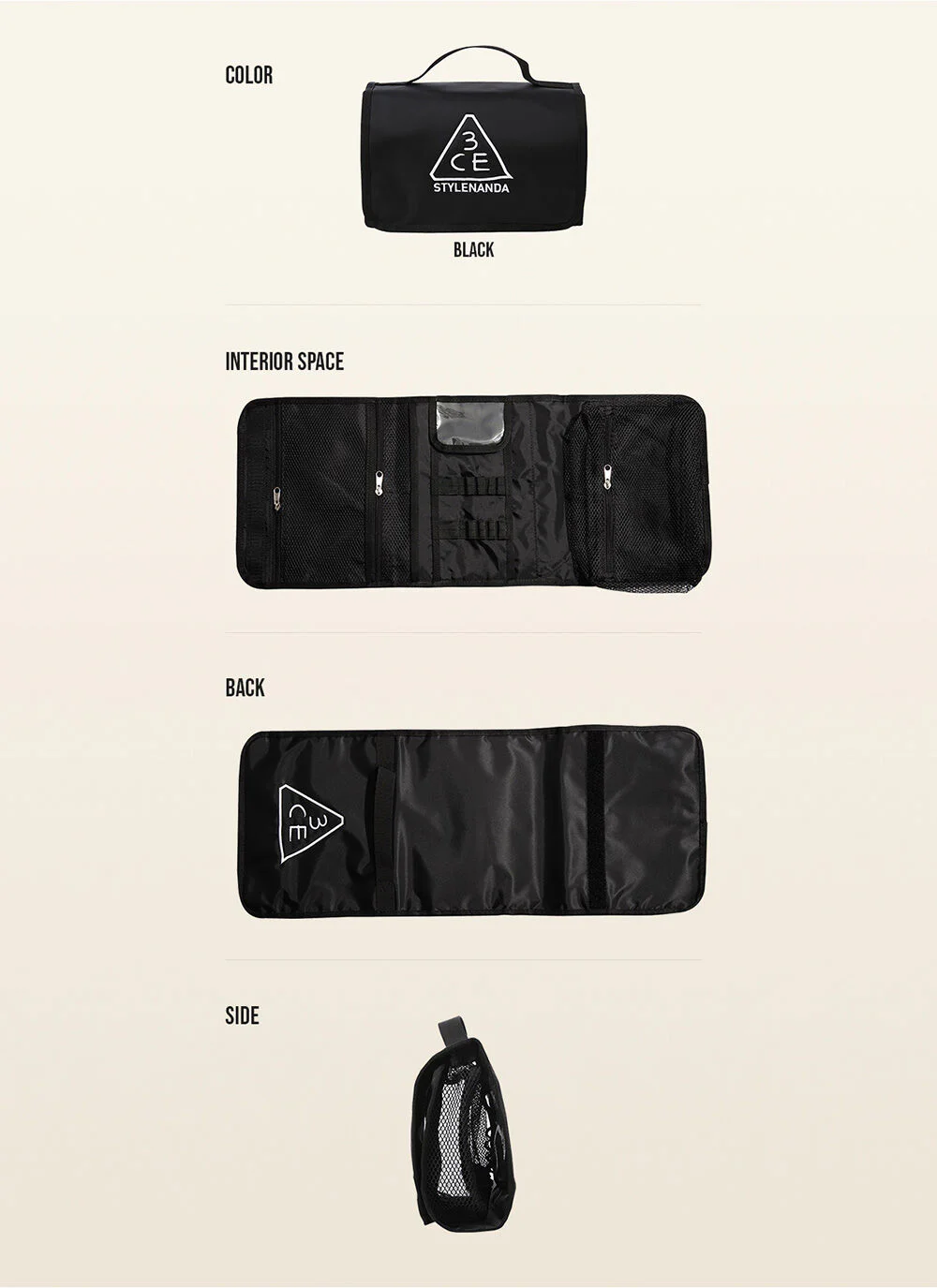 3CE Wash Bag 1pc #Black The versatile black bag is designed for the beauty enthusiast who is always on the go. It comes with a perfect storage design and durable materials. It is perfect for everyday use.