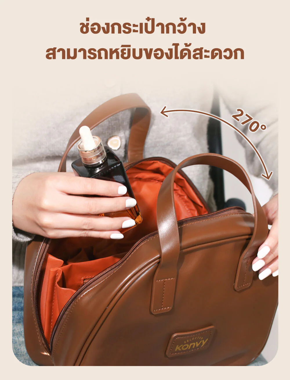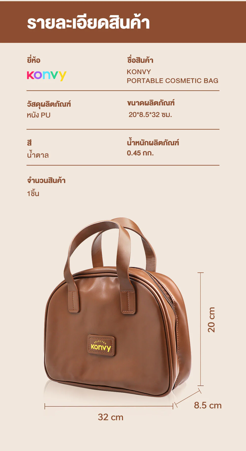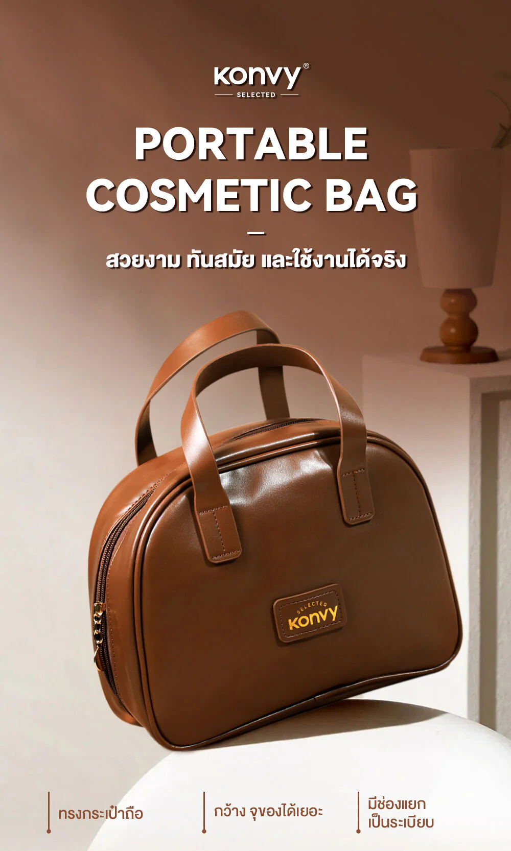 Konvy Portable Cosmetic Bag 1pc #Brown Brown cosmetic bag, vintage design, made of high-quality materials, meticulously sewn, with compartments for makeup brushes and other compartments to help organize and separate cosmetics neatly, with handles for holding and hanging on the arm, convenient to carry.
