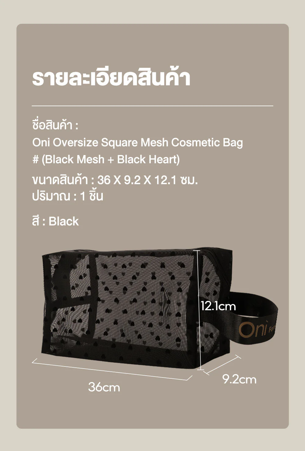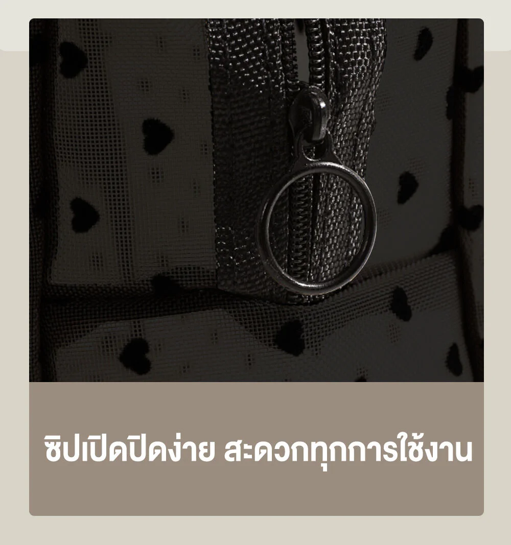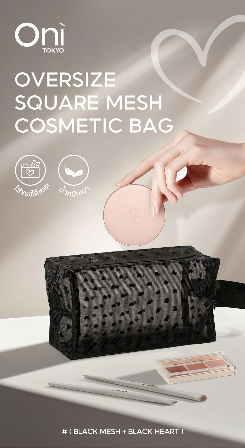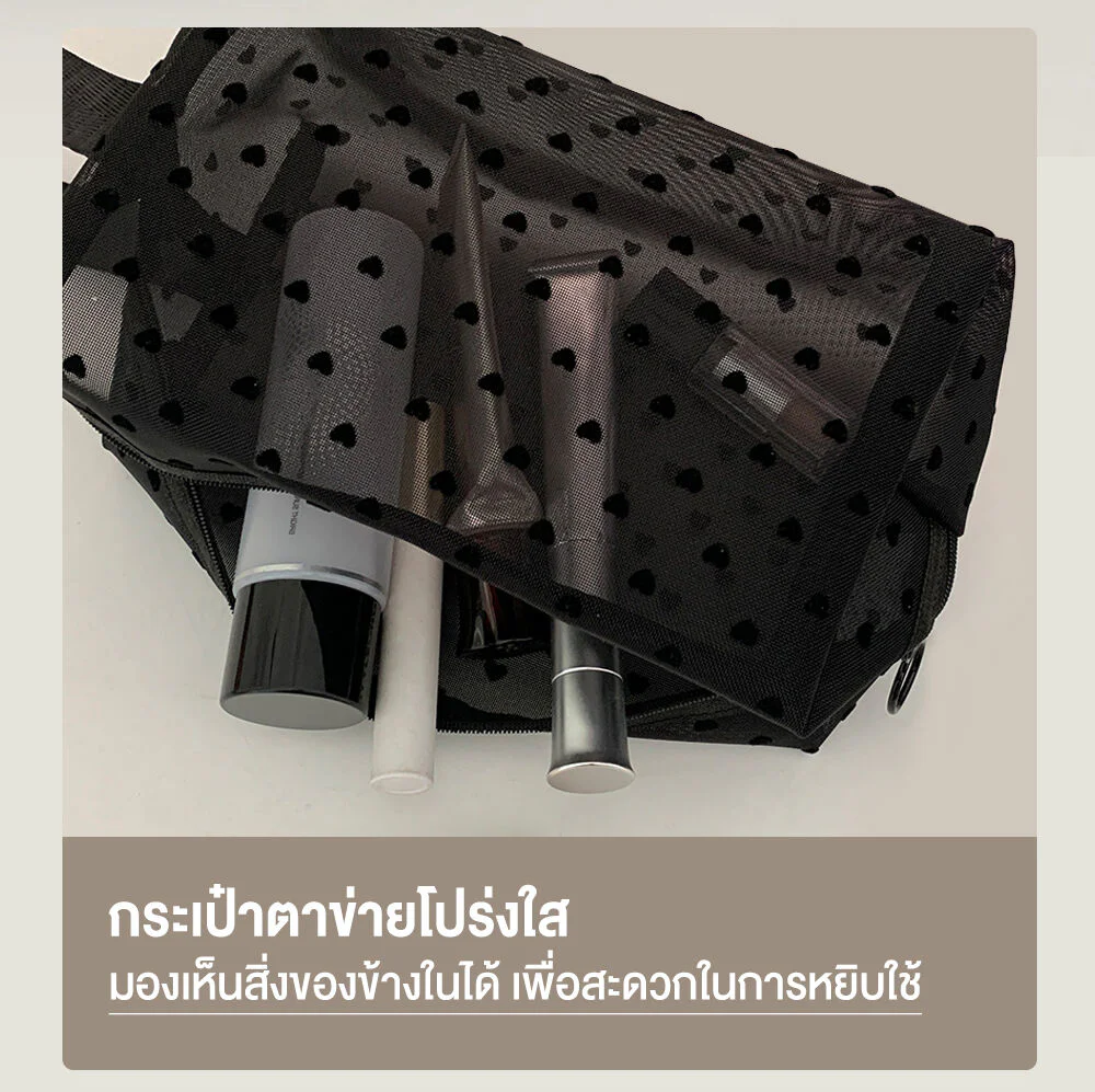 Oni Oversize Square Mesh Cosmetic Bag #Black Mesh Black HeartThis black, square-shaped, transparent mesh cosmetic bag features a distinctive black heart. Made from high-quality materials, it is lightweight, durable, and has a large capacity. It comes with a hand strap for easy carrying.