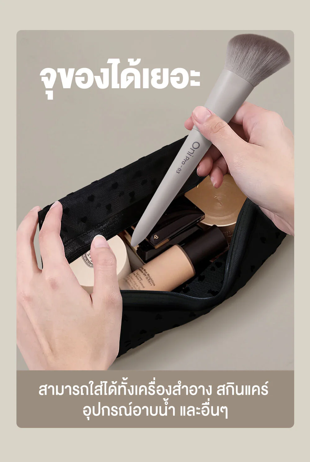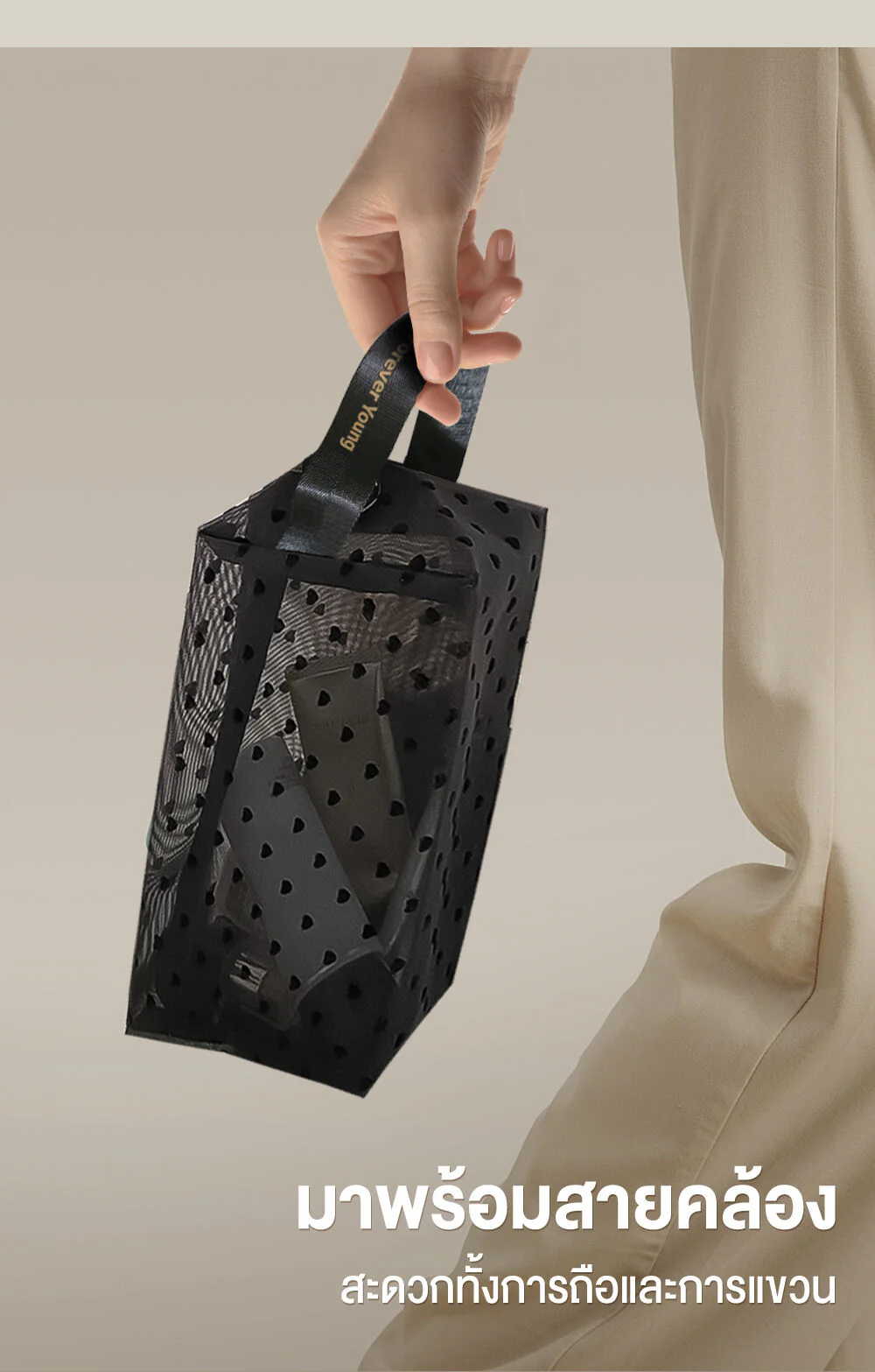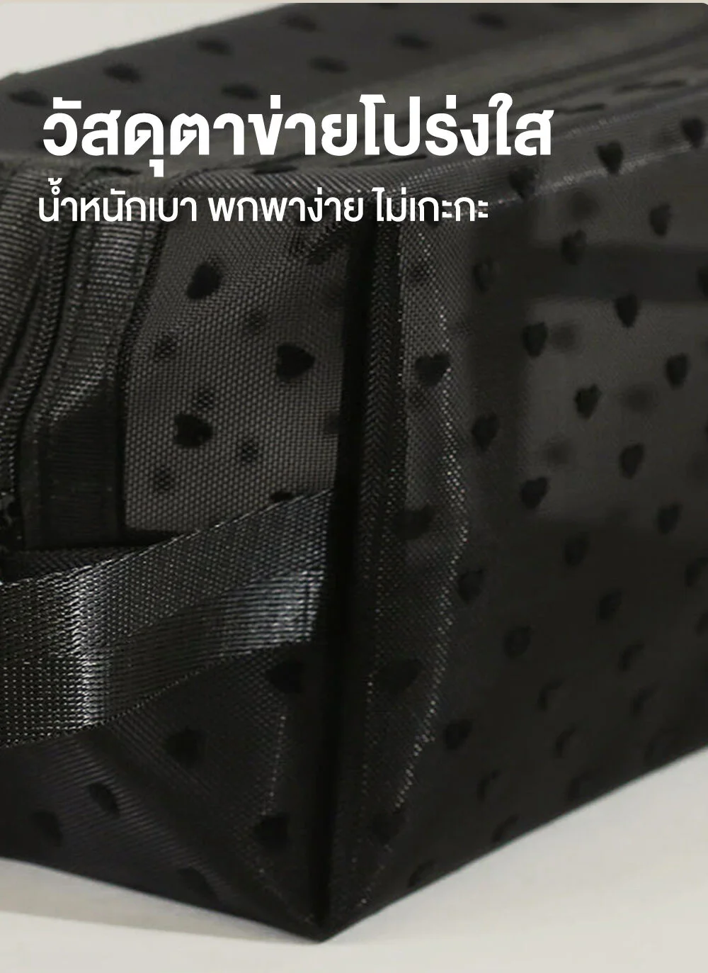 Oni Oversize Square Mesh Cosmetic Bag #Black Mesh Black HeartThis black, square-shaped, transparent mesh cosmetic bag features a distinctive black heart. Made from high-quality materials, it is lightweight, durable, and has a large capacity. It comes with a hand strap for easy carrying.