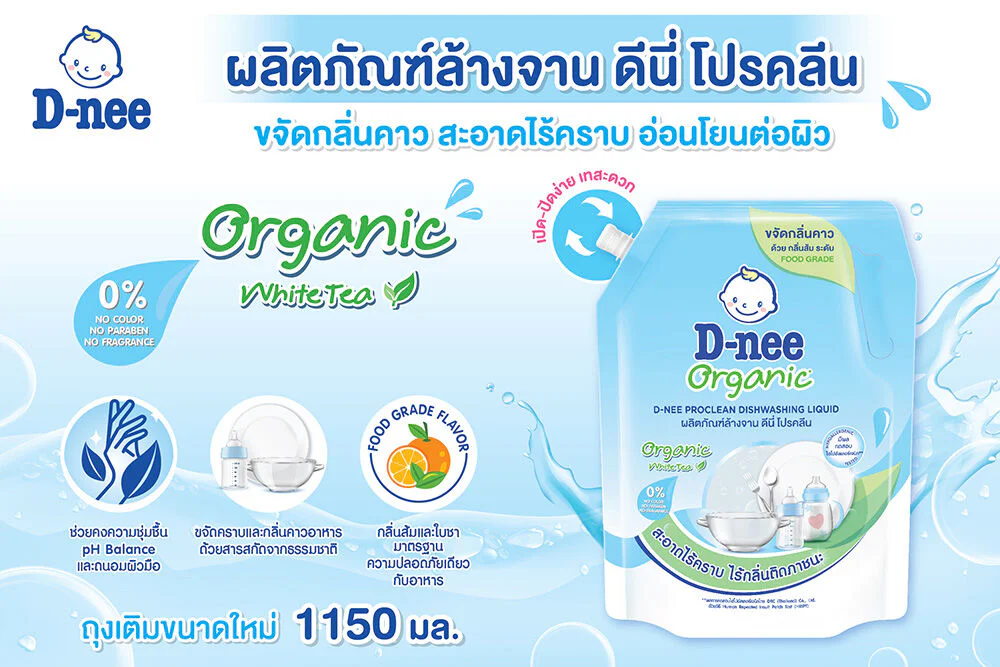D-nee Proclean Dishwashing Liquid Organic White Tea 1150ml Dishwashing product, combined with organic white tea extract and natural cleaning agents, helps remove stubborn food stains thoroughly, while maintaining moisture and preserving hands. Gentle on the skin and has a refreshing scent of orange and tea leaves, using Food Grade standards.