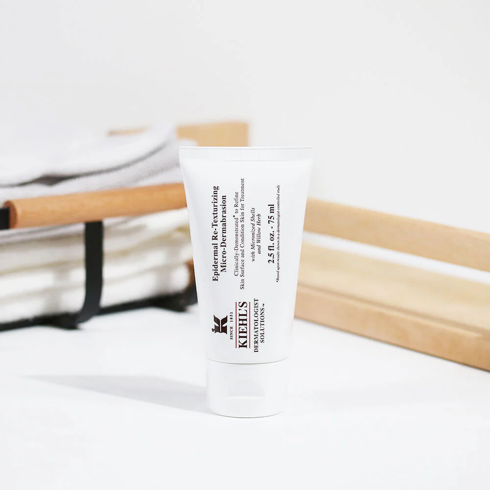 Kiehls Epidermal Re-Texturizing Micro-Dermabrasion 75ml This powerful exfoliating product smooths the skin, helping to reduce the appearance of dark spots and minor scars on the face, hands, and décolletage. It also minimizes pore size and allows targeted skin treatments to penetrate and work more effectively.