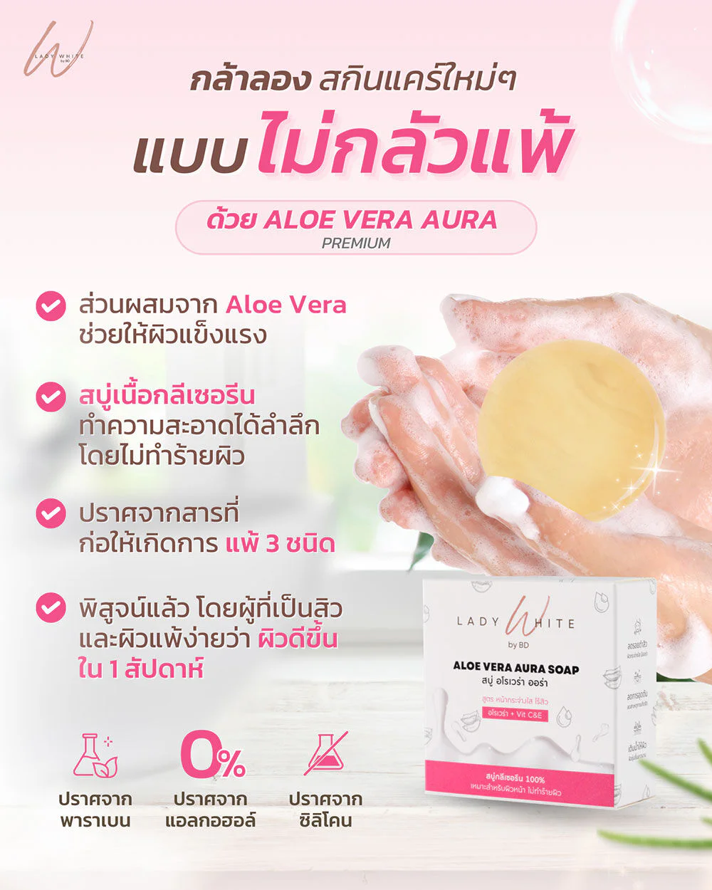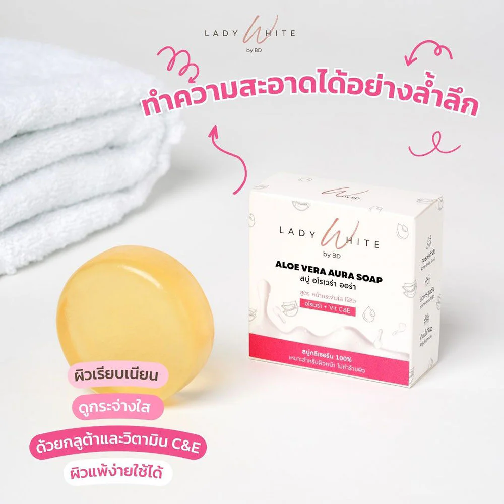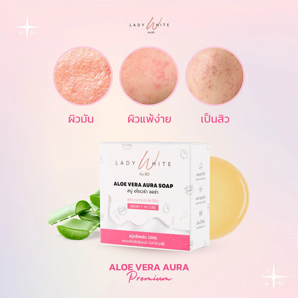 Lady White Aloe Vera Aura C&E Acne Soap [70g x 2pcs] A facial cleanser and nourishing product in one step for oily, acne-prone skin. Helps treat recurring acne problems and reduce the appearance of acne scars. Helps brighten skin. Gently cleanses even sensitive skin without irritating or drying it out.