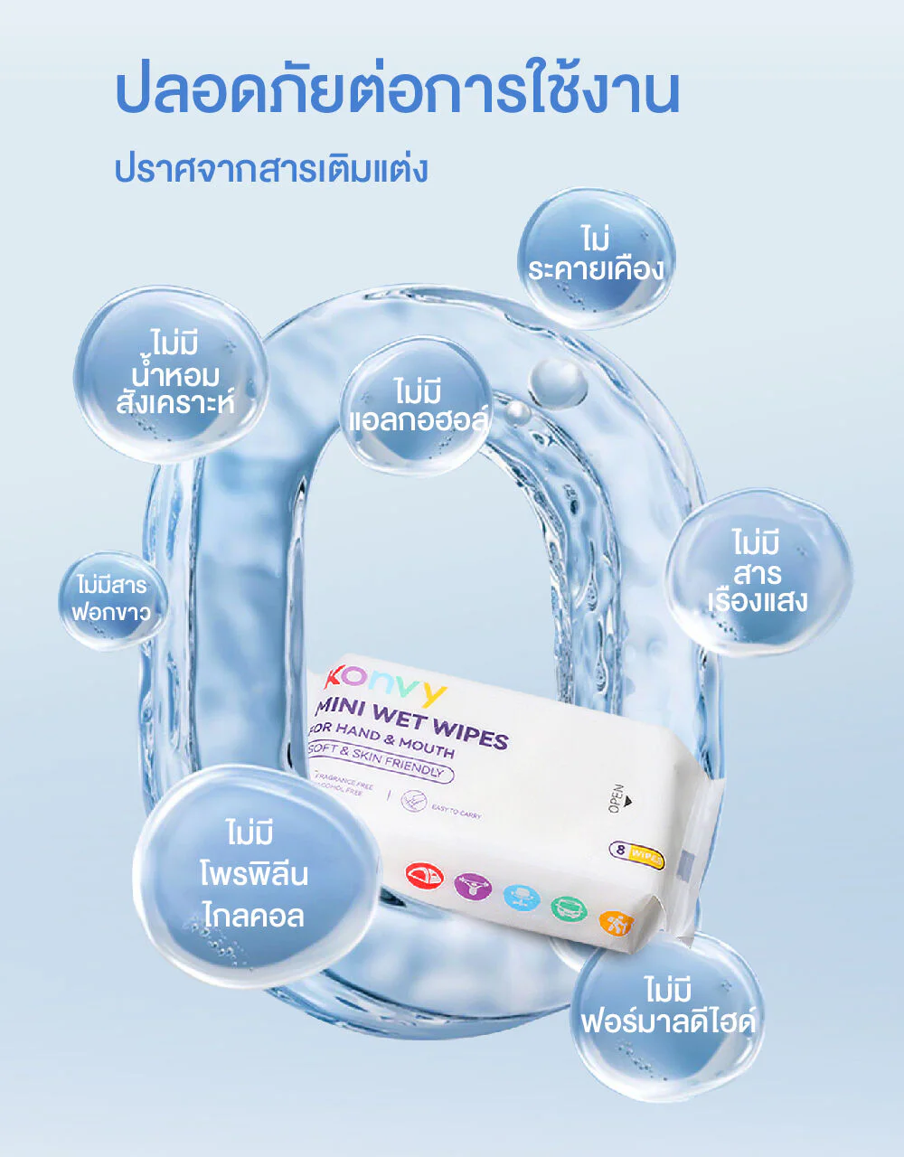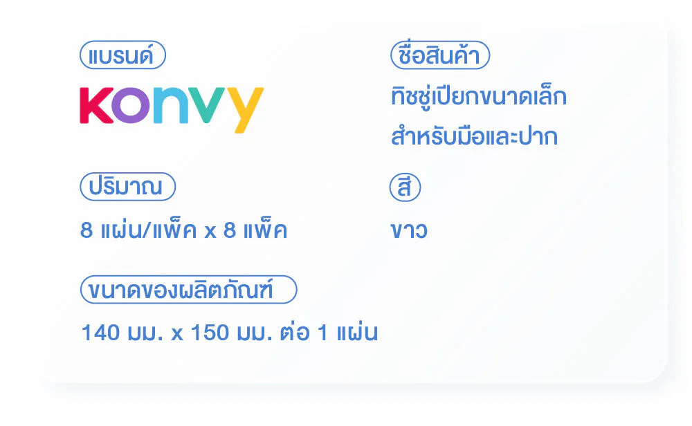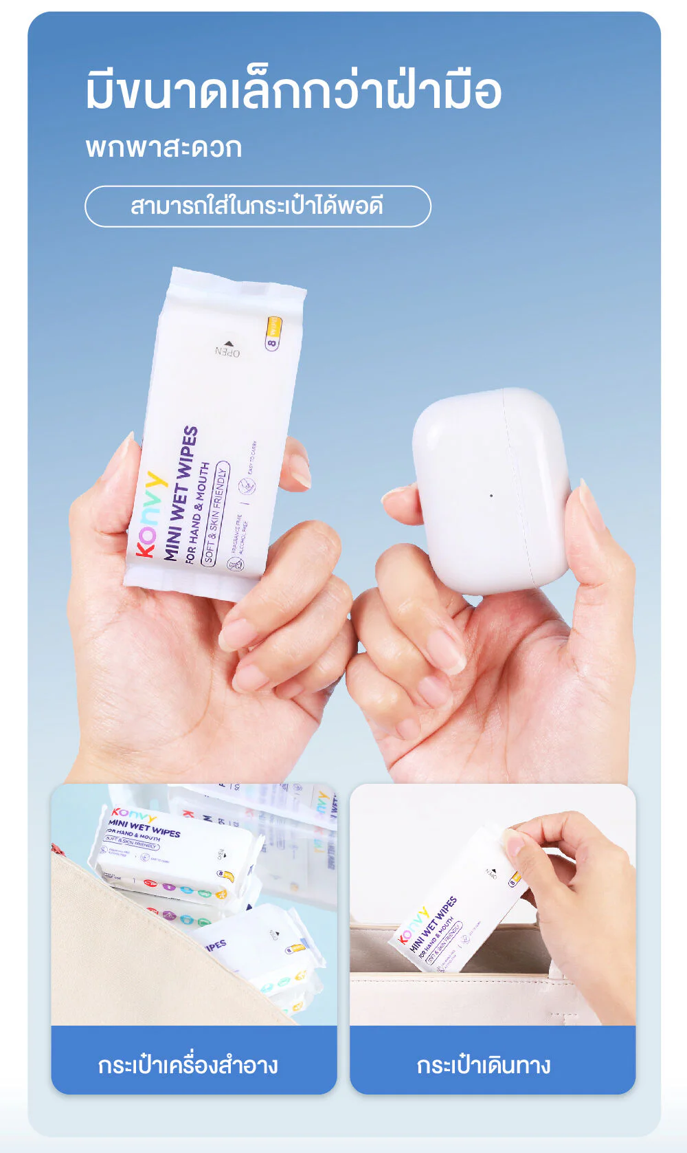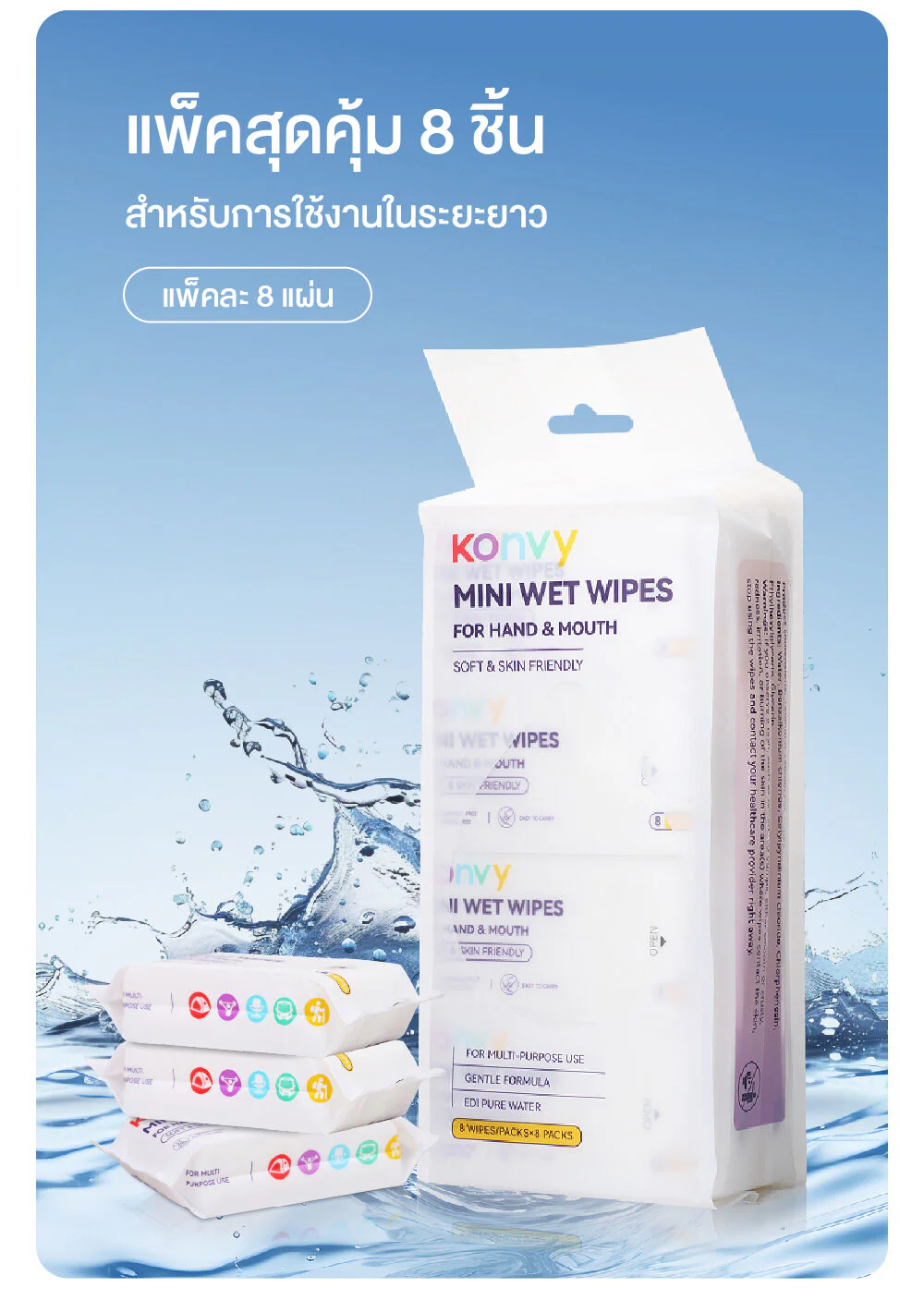 Konvy Mini Wet Wipes For Mouth & Hand [8 Wipes x 8 Packs]For good hygiene with wet tissues for wiping hands and mouth, mini size, 8 sheets 8 packs Made from pure water Helps clean gently. The fabric is soft to the touch and does not irritate the skin. Can be used for many purposes. Compact size, easy to carry.
