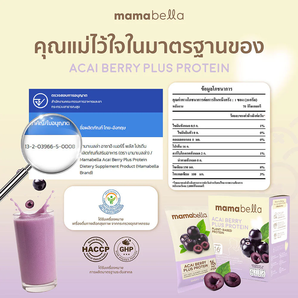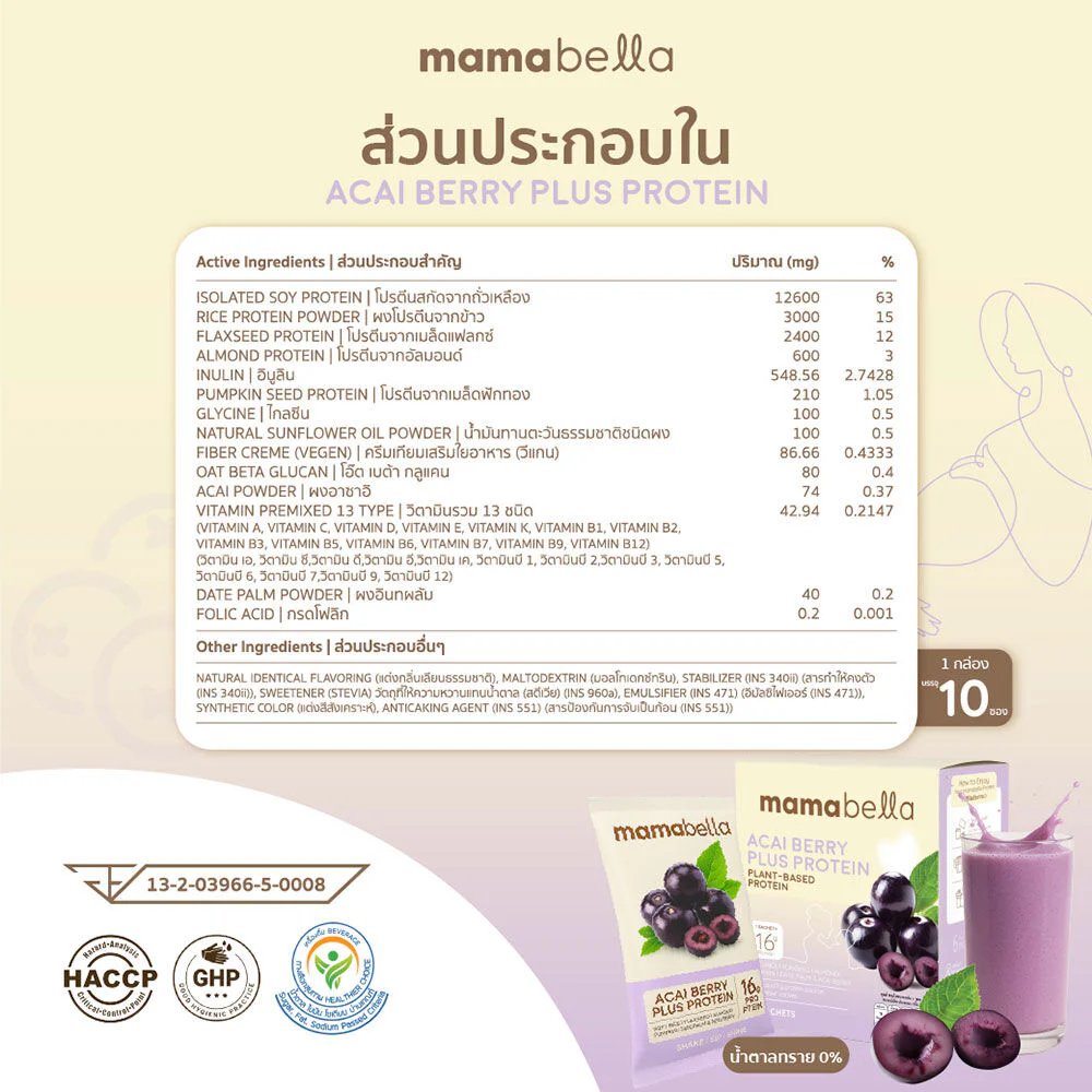 Mamabella Instant Plant Protein Plus Acai Berry Beverage Powder [20g x 10pcs] Protein for pregnant and breastfeeding mothers, packed with 16 grams of plant protein per sachet.