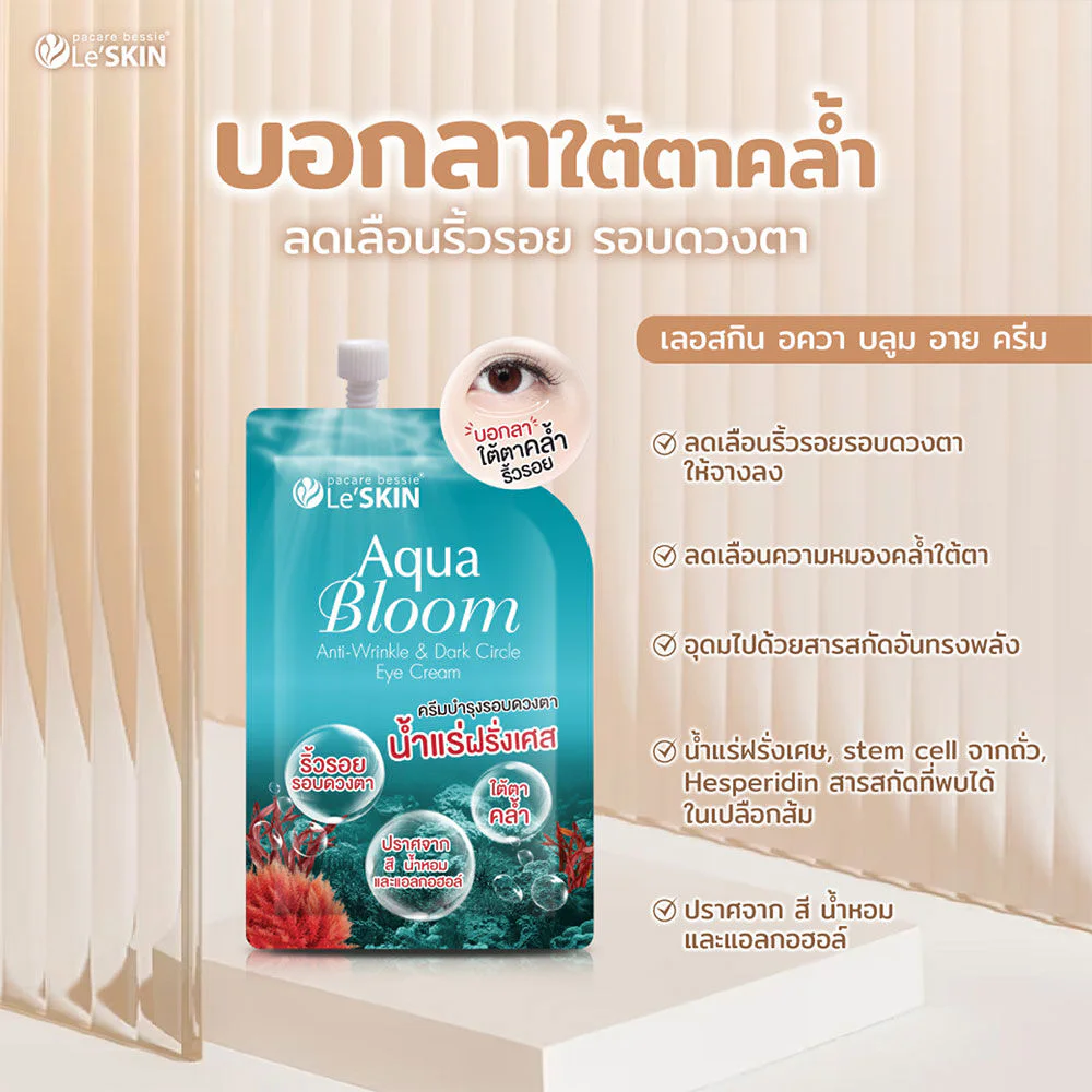 Le'SKIN Aqua Bloom Anti-Wrinkle & Dark Circle Eye Cream 8ml This eye care product is enriched with powerful yet gentle extracts. Alpha Glucosyl Hesperidin helps reduce dark circles around the eyes, combined with Argireline and Soy-Cell to diminish the appearance of fine lines, and Earth Marine, a natural mineral water from France, to hydrate and brighten the delicate skin around the eyes, giving it a youthful appearance.