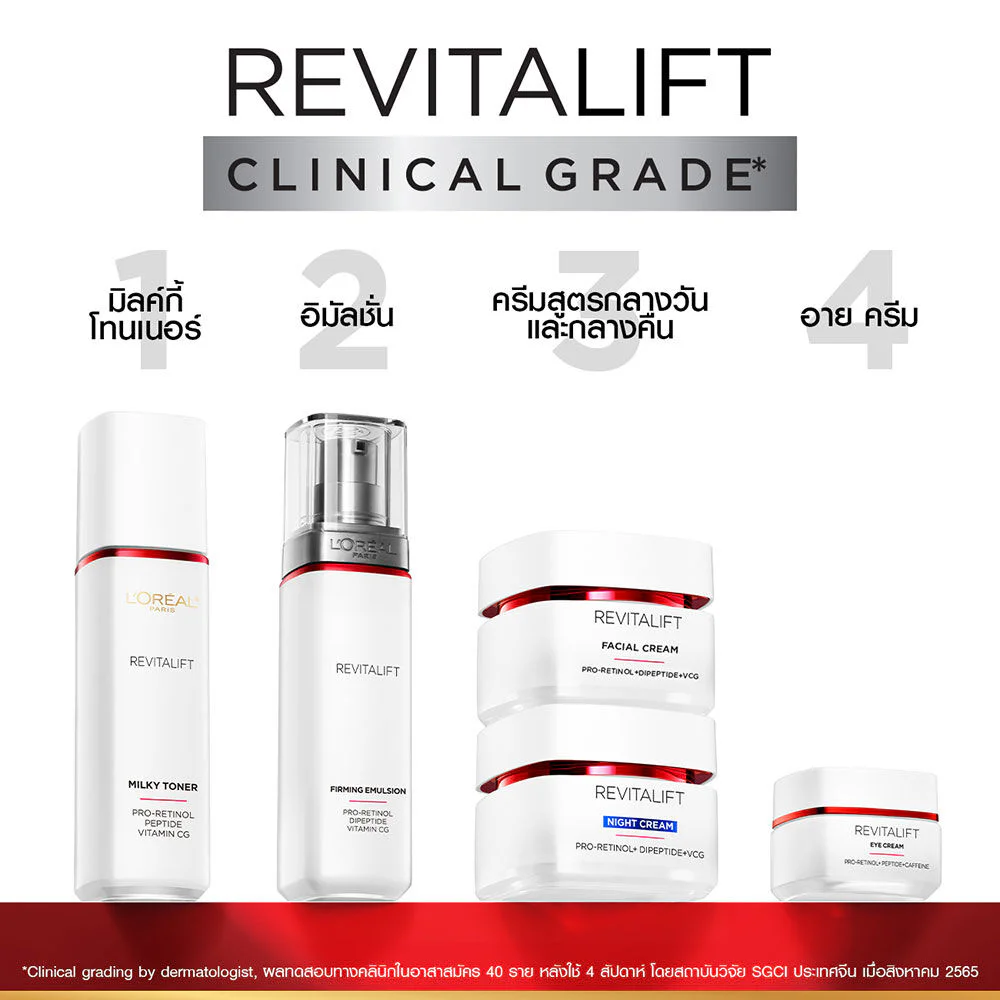 Loreal Paris Revitalift Clinical Grade Advanced Anti-Wrinkle Firming Eye Cream 15ml This eye cream combines powerful dermatologist-inspired ingredients like Pro-Retinal, Di-Peptide, Caffeine, and Vitamin CG to reduce the appearance of wrinkles and dark circles, while restoring the skin around your eyes for a smoother, firmer, brighter, and more youthful appearance.