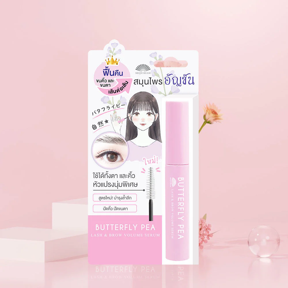 Meiji Cream Butterfly Pea Lash & Brow Volume Serum 6g Eyebrow and eyelash nourishing product, clear gel texture, no color, gentle formula, enriched with butterfly pea extract, helps nourish eyelashes to be long, reduce breakage and fall out, and can also style eyebrows.