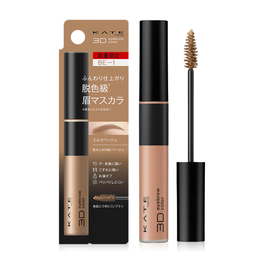KATE 3D Eyebrow Color Z 6.3g #BE-1 This limited-edition eyebrow mascara features intense pigments and a lightweight, sweat-proof liquid texture that won't smudge throughout the day. It helps adjust dark eyebrow color to a soft, natural look, and locks in beautiful, full eyebrows. It comes with a small brush head, making it easy to brush your eyebrows.