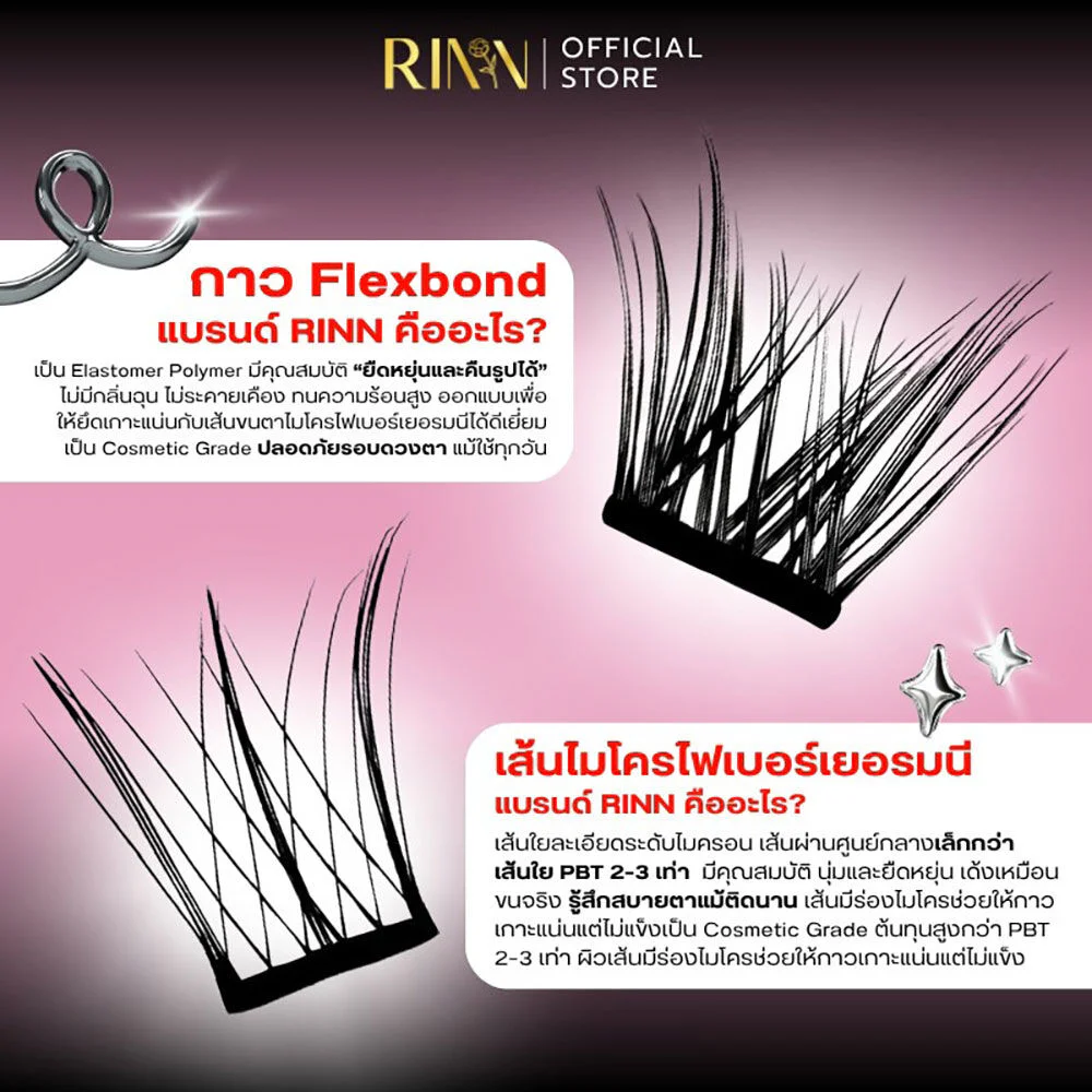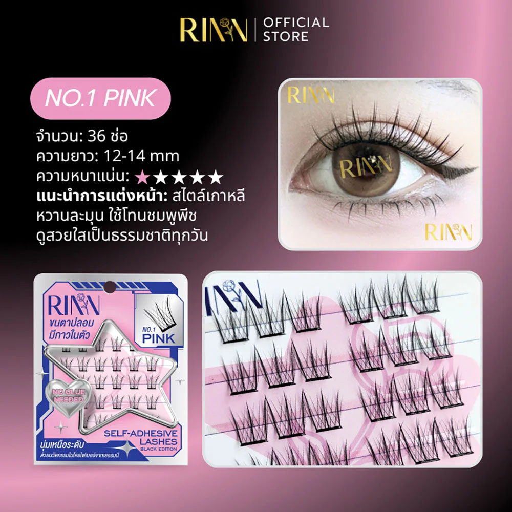 RINN Self-Adhesive Lashes - Black Edition 36pcs #No.1 Pink False eyelashes with built-in adhesive, Flexbond black glue model, flexible, can return to its shape, and last all day long. Soft eyelashes with innovative microfiber from Germany. Even beginners can look beautiful. Easy to apply, doesn't take long.