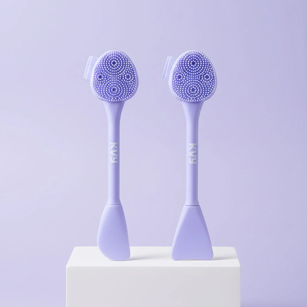 KVY Facial Cleansing Brush & Mask Applicator Fan Shape #Purple Silicone facial cleansing brush and mask spatula, purple, 2-in-1 design in one handle, made from soft silicone (Silicone & ABS) that is gentle on sensitive skin, helps to deeply cleanse pores, with a mask spatula designed to apply the mask evenly and save product.