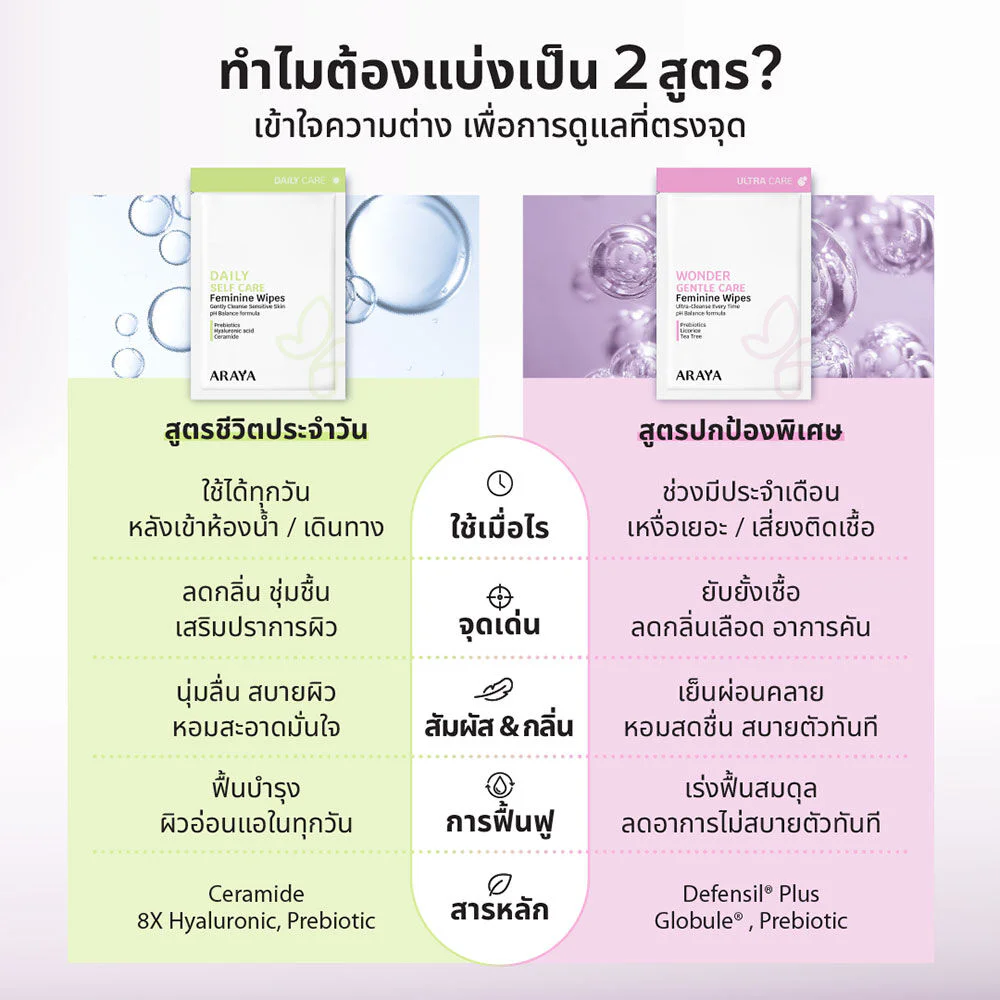 •ARAYA Wonder Gentle Care Feminine Wipes Special protection formula (for that time of the month) protects during times when infection is likely, inhibits bacteria, fungi, deodorizes vaginal discharge, soothes the skin, reduces itching and irritation, contains prebiotics to maintain a healthy balance of microorganisms.