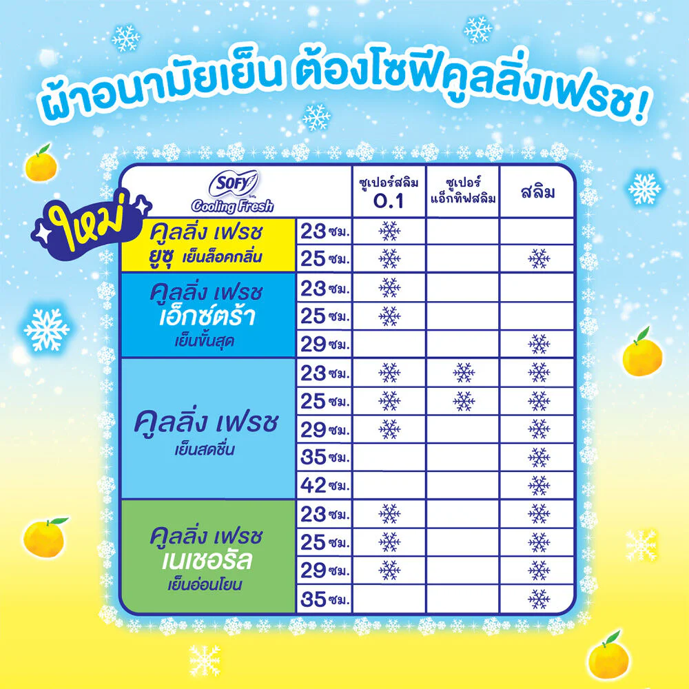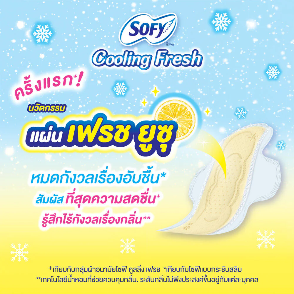 Sofy Cooling Fresh Yuzu Super Slim 0.1 Wing 25cm [12pcs x 5packs]A new generation of cool idols! These 25cm-long, winged sanitary pads feature the innovative "Fresh Yuzu Sheet." Eliminate worries about dampness and experience the ultimate freshness, without worrying about odor.