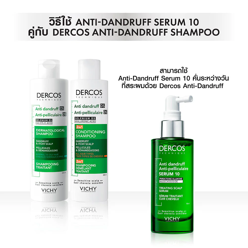 Vichy Dercos Anti Dandruff Treating Scalp Serum 90ml Scalp serum, fast absorption, not oily, not sticky, easy to use with ingredients from Piroctone Olamine, Madecassoside and 1% Vitamin Cg helps reduce dandruff, itching, excess oiliness, and restores the scalp that has been damaged by various pollutants to return to being strong and healthy