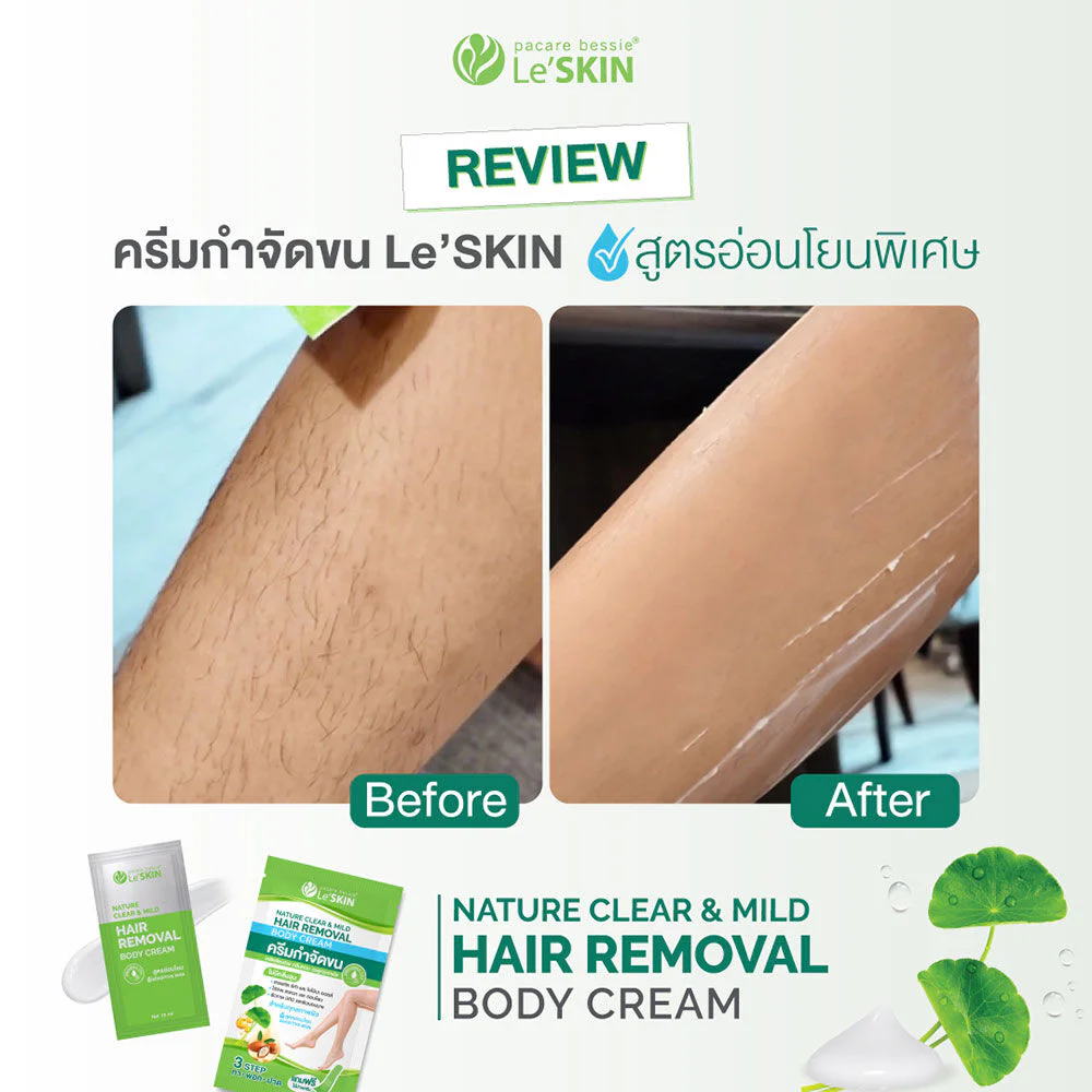 Le'SKIN Nature Clear & Mild Hair Removal Body Cream 15ml This hair removal cream provides quick and easy hair removal. Its special gentle formula is suitable for use on legs, arms, underarms, and the bikini line. Enriched with moisturizers from Centella Asiatica and Jojoba Oil, it gently removes hair while nourishing the skin, leaving it smooth and soft.