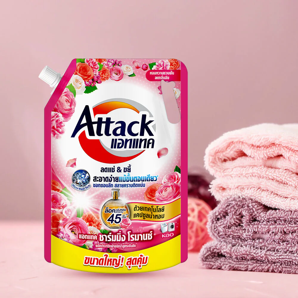 Attack Charming Romance Concentrated Liquid 2100mlConcentrated liquid detergent helps remove tough stains deep into the fabric fibers, leaving clothes clean.The sweet fragrance of flowers And helps reduce musty odors with Microwash technology, an innovative cleaning technology with a concentrated enzyme formula that effectively cleans and dissolves stubborn stains on clothes in just one washing step with a washing machine.