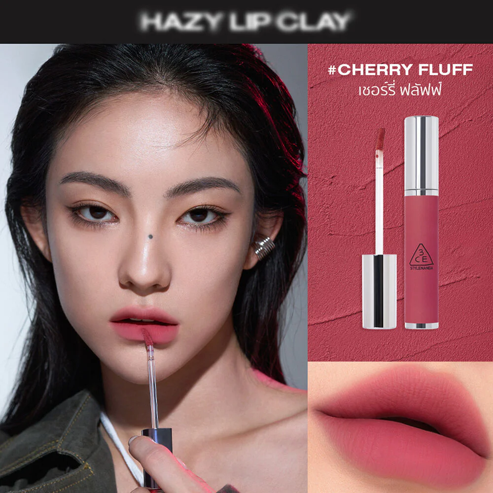 3CE Hazy Lip Clay 4g #Cherry Fluff Matte lipstick with clear pigments, soft and smooth touch, light and comfortable on the lips, easy to spread, no clumps, long-lasting, comes with Hydro-Clay Sensation technology, the clay melts with the lips, giving beautiful, perfect lips, giving the ultimate matte finish.