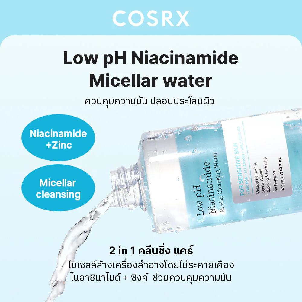 COSRX Low pH Niacinamide Micellar Cleansing Water 400mlMicellar Cleansing Water with Niacinamide gently removes makeup and dirt, controls excess oil, and is pH balanced so it doesn’t strip or irritate the skin, helping transform sensitive skin into healthy skin.