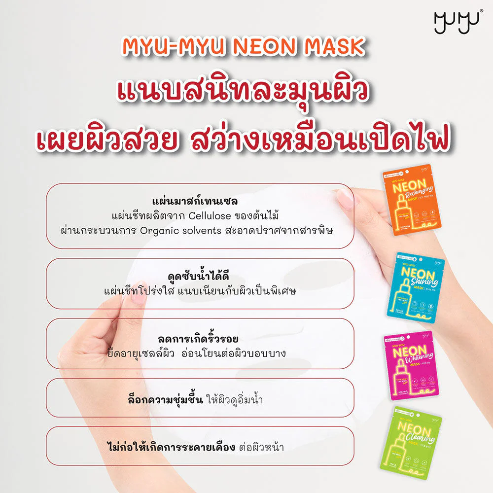 MYU-MYU Neon Clearing Mask 25g This acne-fighting facial mask is enriched with Mandarin Clear extract to deeply nourish and revitalize the skin, leaving it smooth, hydrated, and radiant. It combines Zinc PCA, Tea Tree Oil, Salicylic Acid, and Witch Hazel to gently exfoliate and reduce the causes and likelihood of acne breakouts. Centella Asiatica and Aloe Vera extracts soothe irritation, revealing smooth, vibrant, and radiant skin.