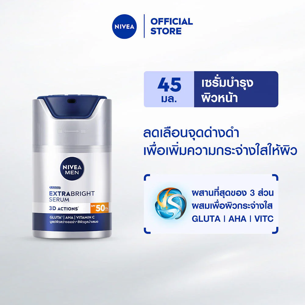 NIVEA Men Extra Bright Serum SPF50 PA+++ 45mlA lightweight serum formula that helps restore dullness and reduce dark spots. It also protects the skin from damage caused by UVB rays.With SPF50 PA+++ and reduce the chance of new dark skin.
