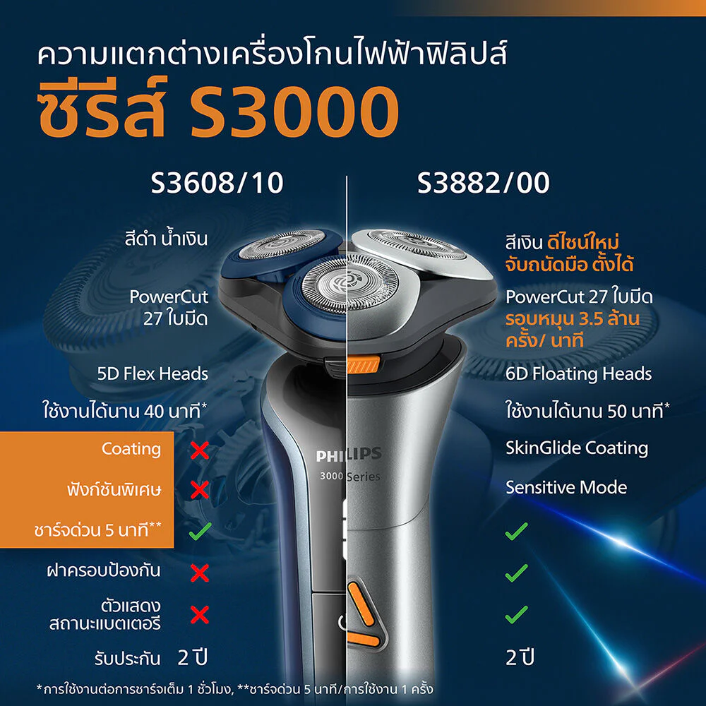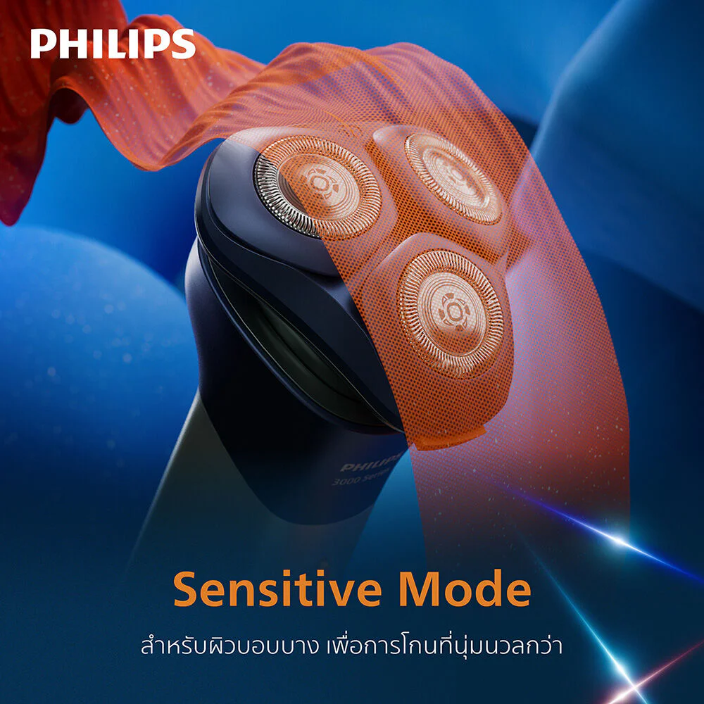 Philips Shaver 3000 Series #S3882/00 Experience a quick, clean, and smooth shave, even on sensitive skin, with this electric shaver. Its 6-dimensional shaving head fits snugly around every part of your face, combining the power of 27 PowerCut Blades with automatic sharpening and a SkinGlide coating to reduce friction. It also has a Sensitive mode for extra gentleness. It can be used both wet and dry, and is waterproof. It also has a cordless battery that lasts up to 50 minutes.