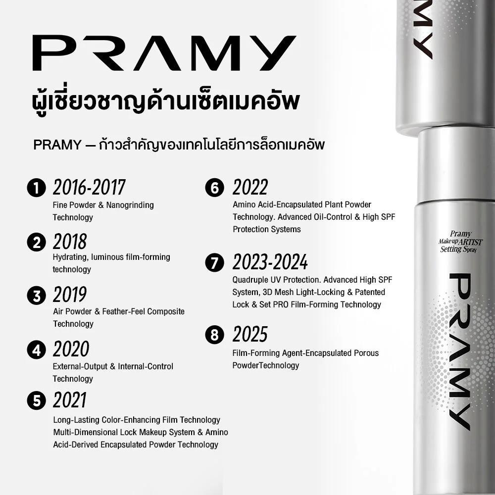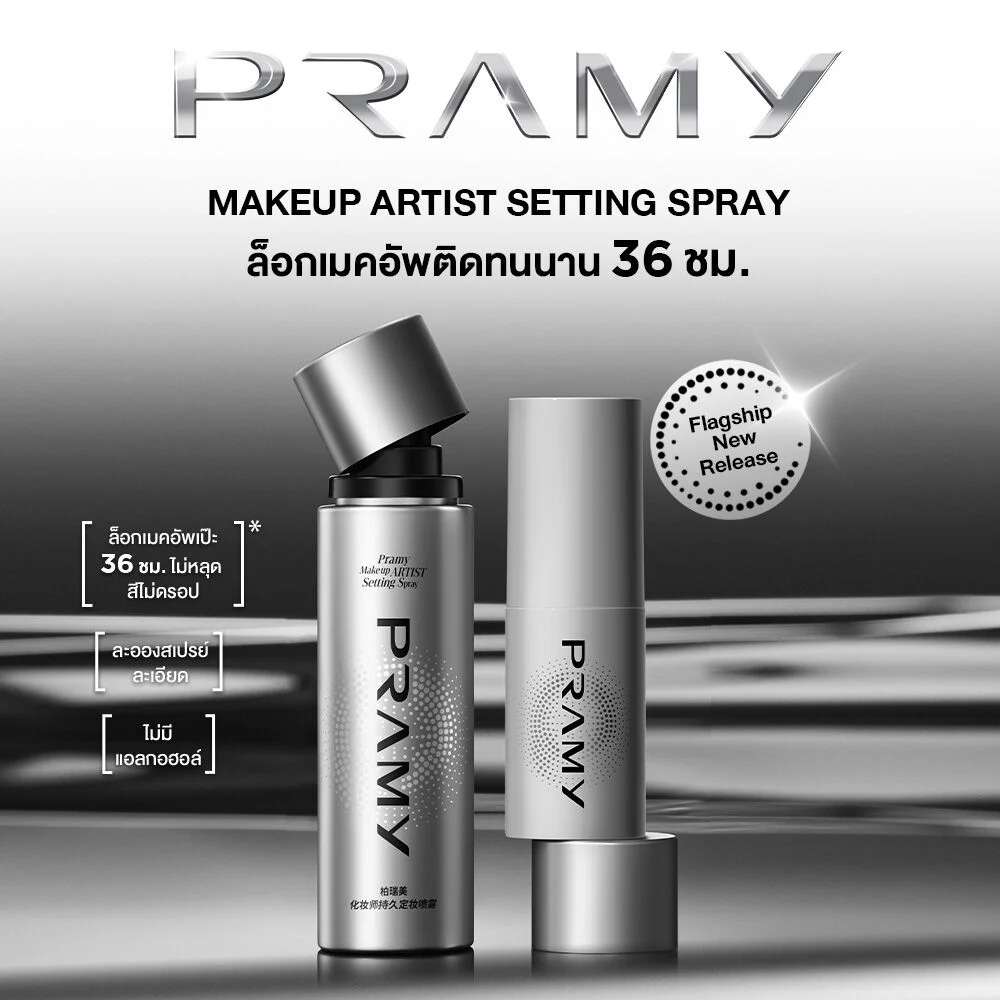Pramy Makeup Artist Setting Spray 30ml Professional makeup locking spray that keeps makeup in place for a long time with a natural finish for oily and combination skin. A new innovation from Pramy Lab with patented Lock-Makeup PRO Set Technology. The mist turns into a film coating the skin within 5 seconds, protecting makeup for longer lasting wear. Doesn't smudge. Waterproof and sweatproof. Perfect for those who do outdoor activities, are exposed to studio light for a long time, or on days when you want makeup to last longer.