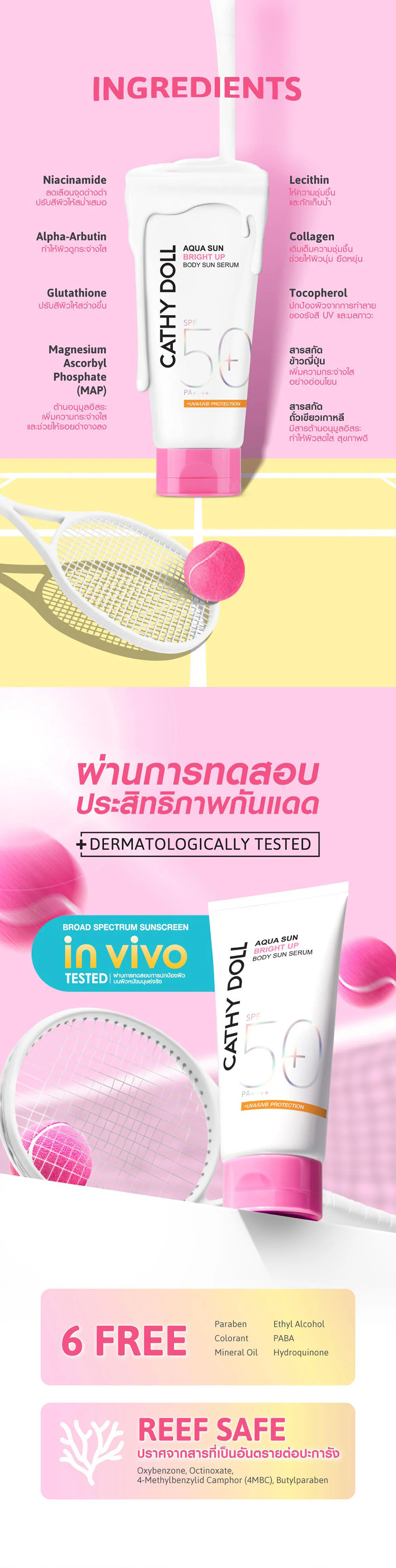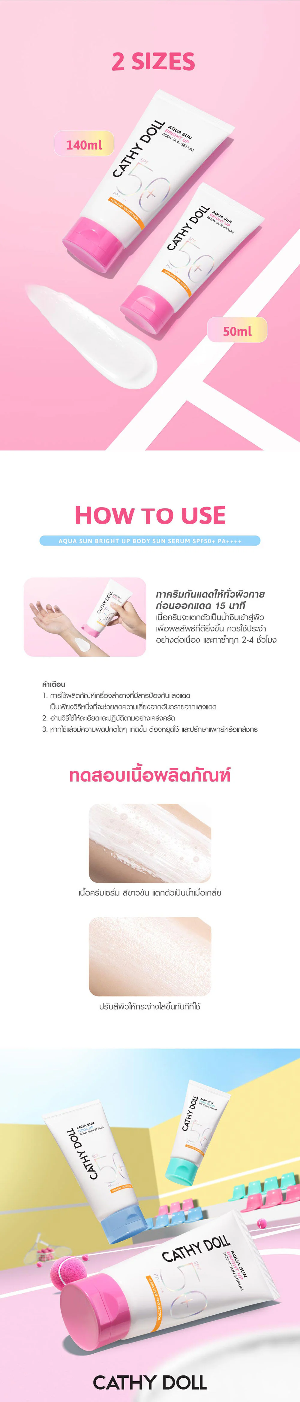Cathy Doll Aqua Sun Bright Up Body Sun Serum SPF50+ PA++++ 50ml Reveal bright skin with aura and protect from sunlight with sunscreen serum for body. Light texture, easy to absorb, not sticky. Adjust skin to look brighter and clearer naturally immediately after application. Helps protect skin from UVA/UVB rays with SPF50 PA+++++ Stop worrying about dark skin accumulated from the sun. Ready to deeply nourish the skin with the power of brightening skin from 4 effective whitening substances: Niacinamide, Alpha Arbutin, Glutathione and Magnesium Ascorbyl Phosphate (MAP), a stable vitamin C derivative. Which work together effectively To help adjust uneven skin tone Make the skin look brighter Dark spots appear to fade Reveal radiant skin with aura Combined with 3 deep nourishing powers from Lecithin, Collagen and Vitamin E Helps strengthen the skin's protective barrier And replenish moisture Ready to restore dry, rough skin, making it soft, flexible, and healthy-looking. Plus, natural skin brightening extracts (2X Herbal Whitening Complex) from Japanese rice extract and Korean mung bean extract help reduce dark spots, gently exfoliate, and restore dull skin to look bright, even, and naturally healthy, ready to tackle all outdoor activities.