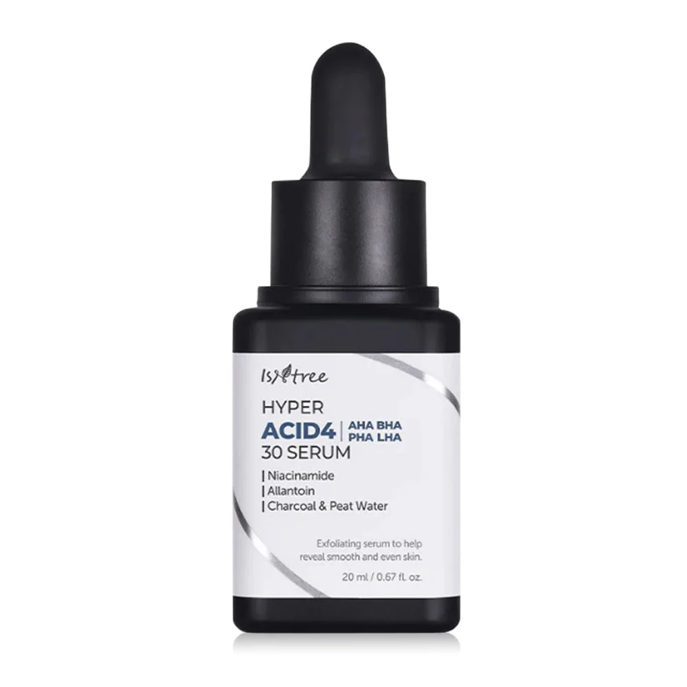 ISNTREE Hyper Acid4 30 Serum 20ml A rinse-off serum that smoothes skin and thoroughly removes dead skin cells, while controlling oil. Enriched with 30 AHA, BHA, PHA and LHA% that gently exfoliate and control excess sebum production for smooth and clean skin. Contains Niacinamide and Allantoin for evening skin tone, while nourishing skin for moisture and smoothness. Effectively unclogs clogged pores and balances skin's oil-water level with Charcoal Powder. Blended with Peach Water that restores skin's elasticity, for a youthful and plump complexion.