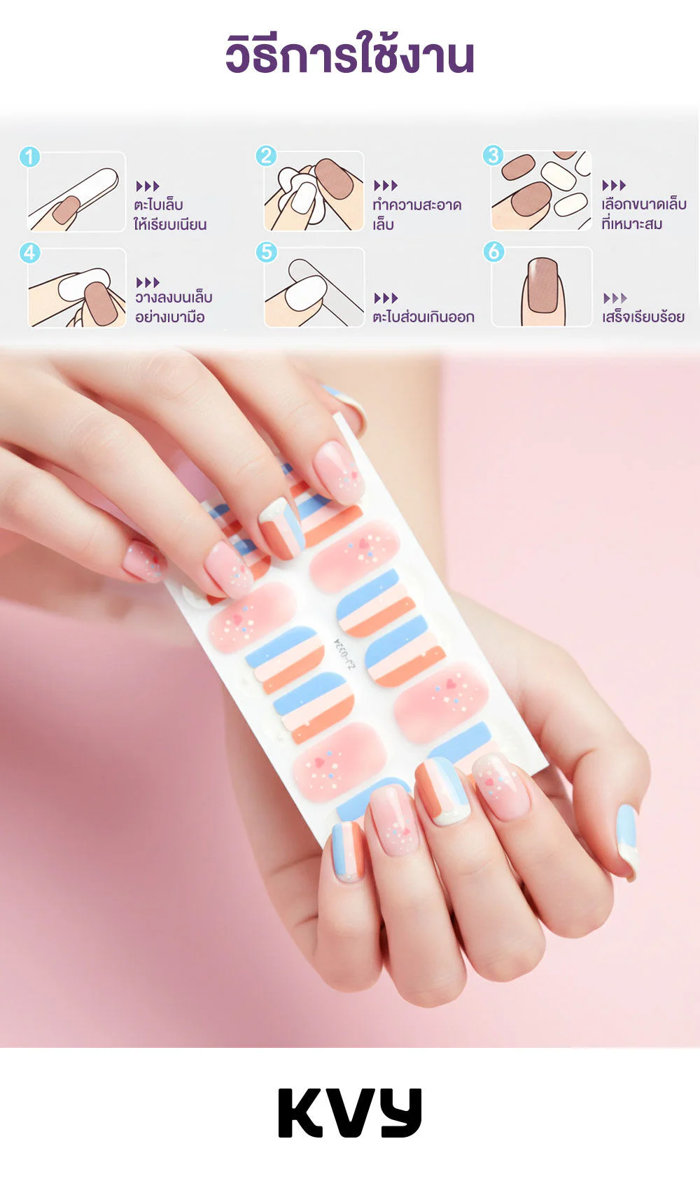 KVY Nail Stickers 14Tips #X-3774 Pink Stripes Easy to apply, quick-drying, shiny, and durable, these Pink Stripes nail stickers are designed for everyday use, without the need for a top coat or UV lamp. Achieve salon-quality nails quickly and easily, and create eye-catching and stylish looks every day.
