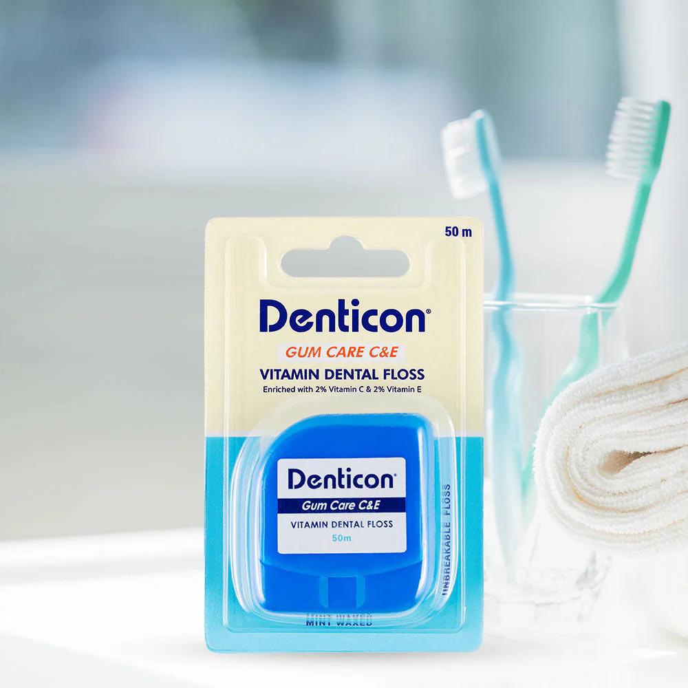 Denticon Dental Floss C&E 50m Dental floss, round, 0.13 cm thick, coated with concentrated vitamin C 2% and concentrated vitamin E 2%, helps take care of gum and tooth health in particular. The floss is made from PP material which is tough and flexible. The floss does not break during use. Coated with wax that provides smoothness, increasing efficiency in scrubbing or rubbing between teeth, with a refreshing mint scent.