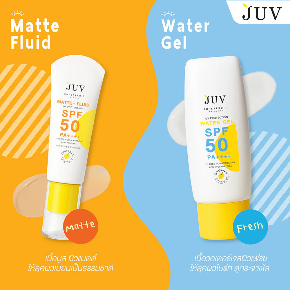 JUV Matte-Fluid UV Protection SPF50 PA++++ 30mlMatte-fluid sunscreen formula provides coverage but is light, along with technology to protect the skin from all light waves (UVA, UVB, Visible Light, IR) pollution and small dust particles, along with extracts to restore the skin from all-around factors with the power of Super fruit, enhanced with special extraction technology, locking in the freshness of the extract for maximum benefit to skin care.