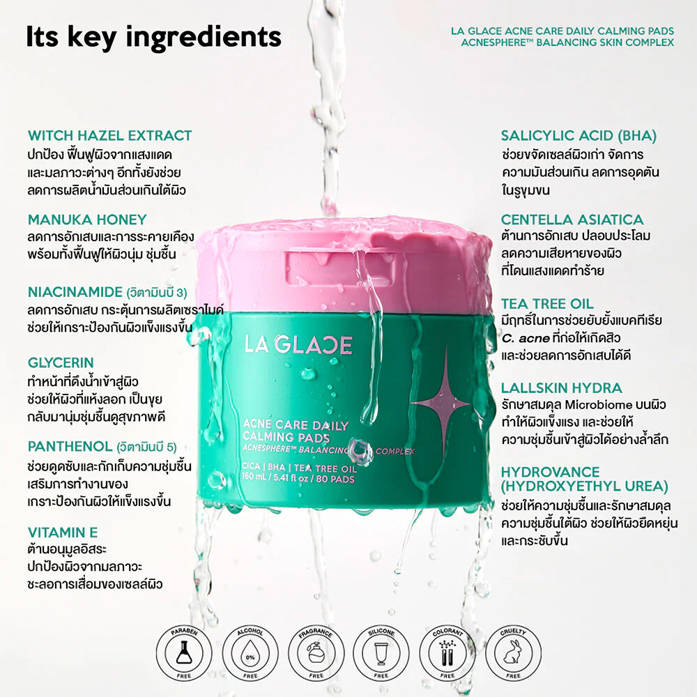 LA GLACE Acne Care Daily Calming Pads 160ml [80 Pads] Acne-prone skin toner pads  that help soothe the skin with ACNESPHERE™, exclusive to La glace, for gentle care of acne-prone skin, reducing the chances of acne and reducing irritation from acne and skin inflammation with 3 combo extracts that understand acne-prone skin.