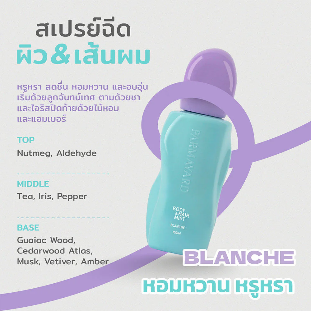 PARMAYARD Body & Hair Mist Blanche 100ml A fragrance spray designed for use on both hair and body. Its light, non-sticky texture is gentle and alcohol-free. It enhances the fragrance and freshness with extracts of cinnamon, mandarin orange, and wild mint. It helps to add freshness and eliminates unpleasant odors. It provides a sweet fragrance. Luxurious, fresh and warm. It opens with nutmeg, followed by tea and iris, and finishes with woods and amber.